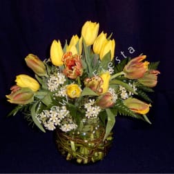 Price: $109.00Local tulip mix in willow bowl with fringe or double tulips included